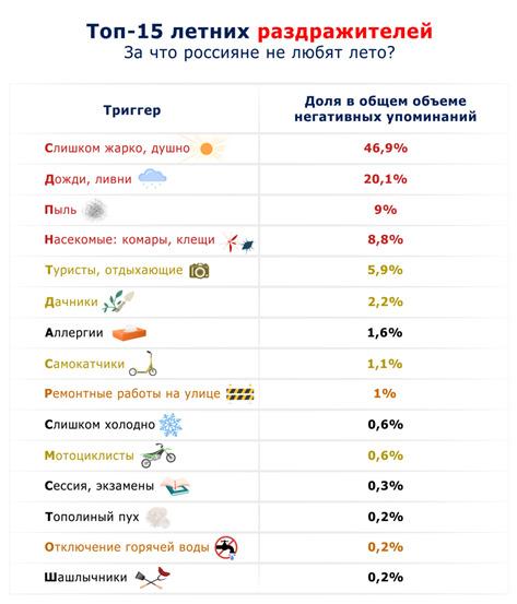 Жара, ливни и пыль стали главными причинами, из-за которых в России не любят лето. Как показало исследование Pro-Vision Communications, природные факторы оказались в «Рейтинге летних раздражителей» выше, чем мотоциклисты, самокатчики и отключение горячей воды.
