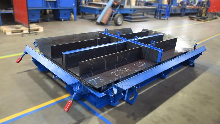 На подвижных продольных бортах предусмотрено 9 точек крепления кондуктора, который фиксирует отсекатели к формующей поверхности. Переставляя отсекатели и фиксируя их кондуктором, можем отливать перемычки, начиная от 1160 мм и заканчивая 2720 мм в крайнем положении. Без использования отсекателей формуем перемычки во всю длину формы — 2980 мм. Шаг большинства изделий составляет 130 мм — это толщина отсекателя. Ширина и высота железобетонных изделий будут неизменными — 380х300 мм (ШхВ).
