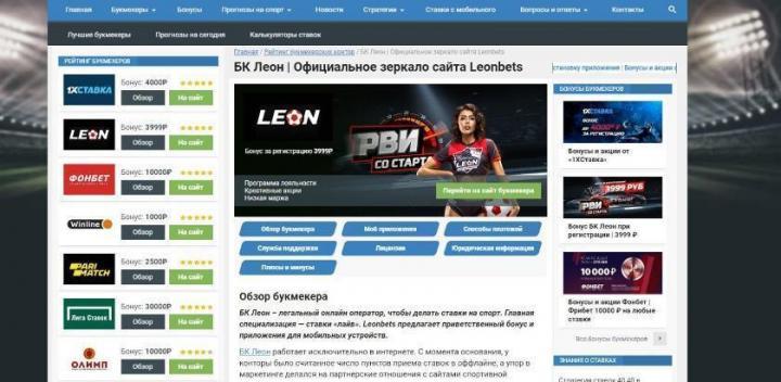 Обзор букмекеров на этом сайте представлен в виде боковой панели, где бетторы могут увидеть небольшую таблицу с БК, их оценками, а также информацией о размере бонуса. Например, чтобы скачать Leonbets на смартфон или ПК, игроку нужно лишь кликнуть на обзор этой букмекерской конторы. В специальном разделе, посвященном мобильным приложениям, можно найти ссылку на скачивание нужного софта. В верхней части обзора представлена кратная информация о букмекере, а также бонусный промокод. Редакция «Спортставок» постоянно обновляет его по мере изменений акций у БК. В обзоре можно найти инструкцию по установке приложения, а также по регистрации и верификации аккаунта.