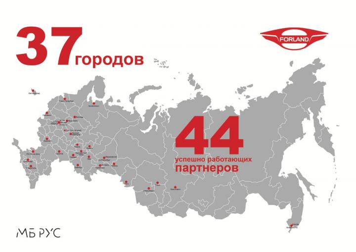 На сегодняшний день дилерские центры FORLAND успешно работают в Центральном, Уральском, Сибирском, Северо-Западном, Приволжском, Дальневосточном и Южном федеральных округах. В ближайшие месяцы планируется открытие новых дилерских центров в Казани, Нижнем Новгороде и Уфе, что позволит укрепить присутствие бренда в крупных городах России.
