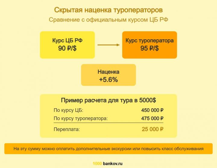 Разница между курсом туроператора и официальным курсом ЦБ РФ — это фактическая скрытая наценка, которую платит турист. При курсе ЦБ в 90 рублей за доллар и курсе туроператора в 95 рублей, наценка составляет более 5%.